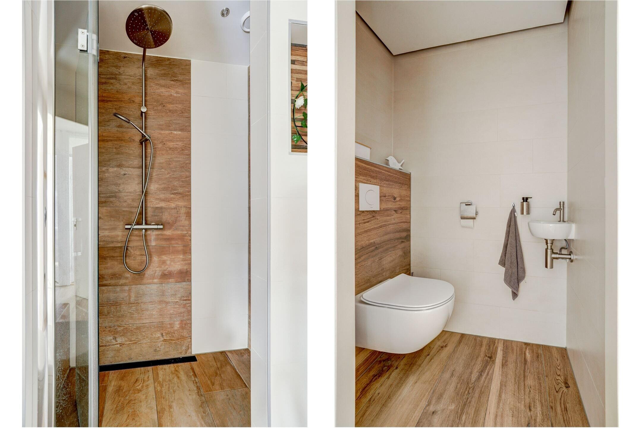 De badkamer (2021) is een echte blikvanger. Luxe afgewerkt met een royale inloopdouche met zitbankje, nissen, een breed wastafelmeubel met op maat gemaakt houten blad en sfeervolle verlichting. Een plek waar elke dag begint als in een wellnessresort.