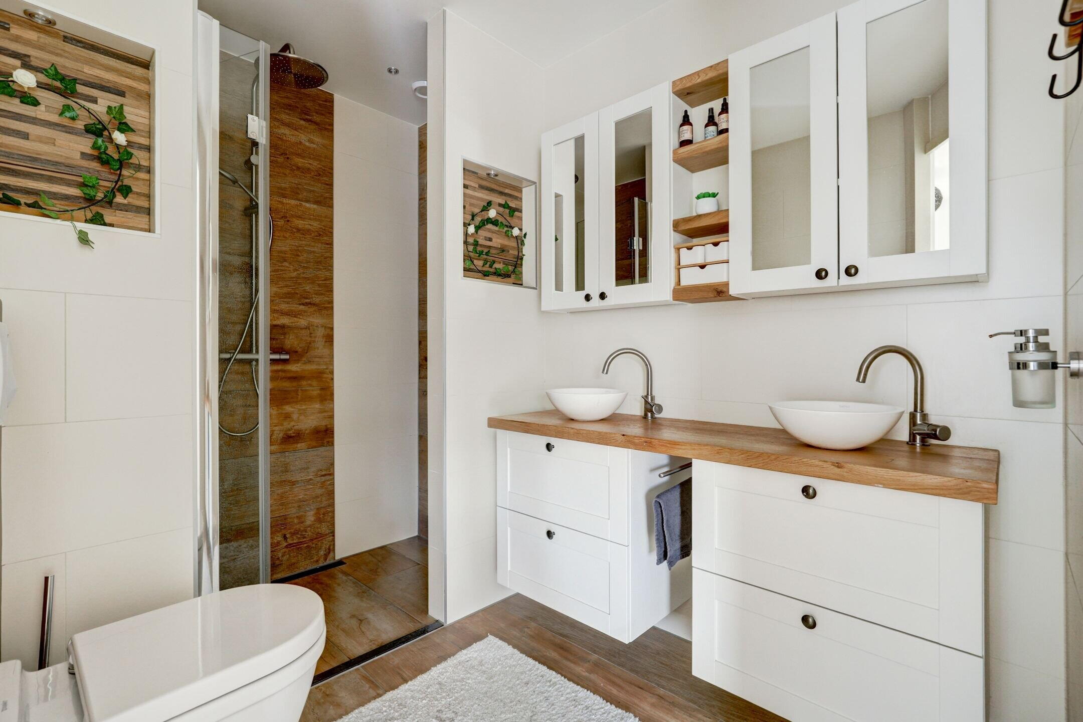 The bathroom (2021) is a true eye-catcher—luxuriously finished with a large walk-in shower featuring a built-in bench and niches, a wide custom-made wooden vanity top, and atmospheric lighting. It’s a place that makes every day feel like a visit to a wellness resort.
