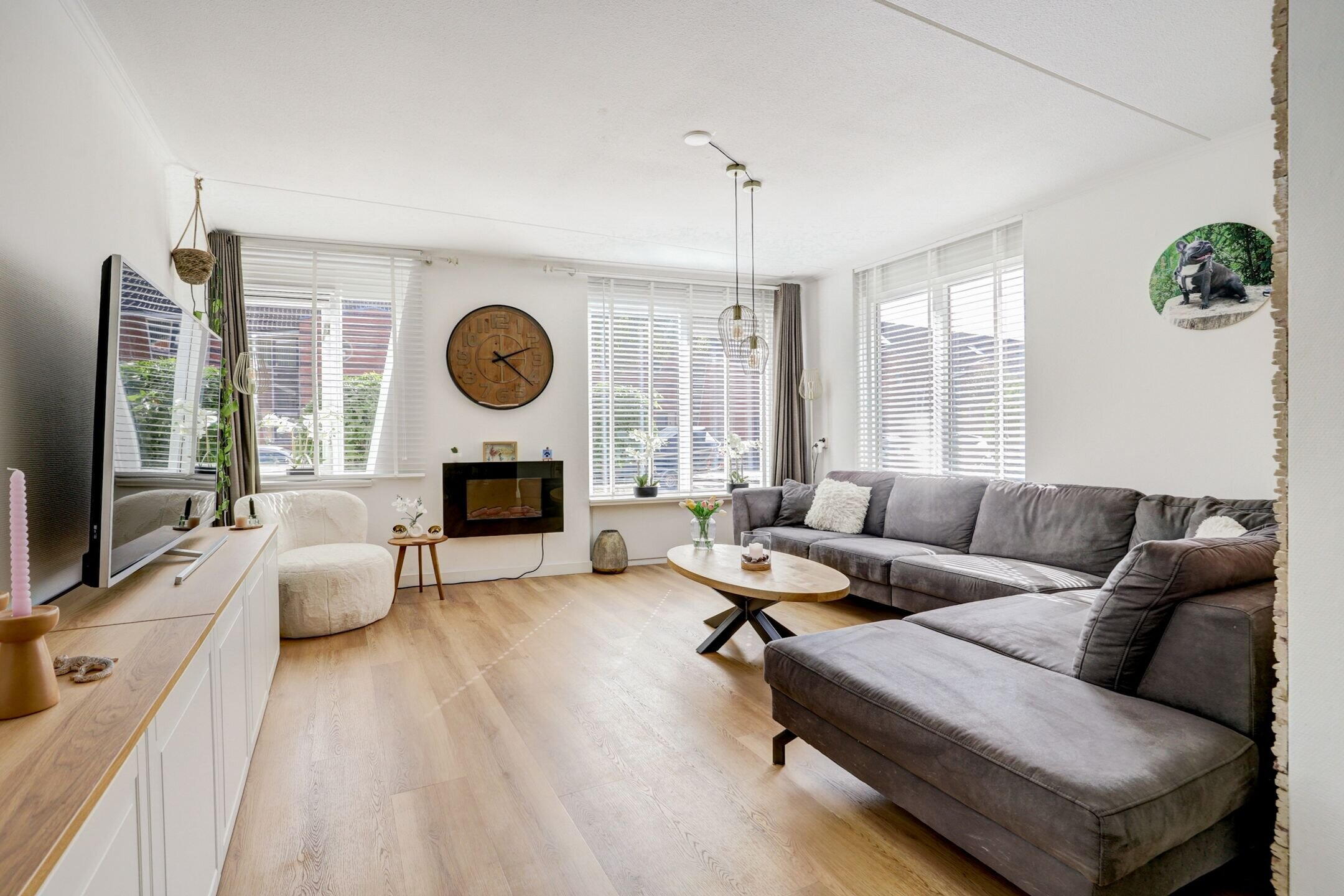 De woonkamer is licht en ruim, met grote raampartijen die de hele dag voor natuurlijke lichtinval zorgen.