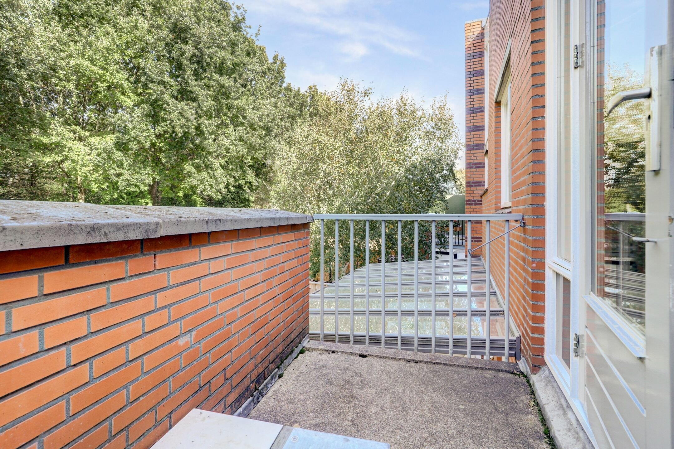 De slaapkamer boven de garage biedt toegang tot het dakterras met een mooi uitzicht op de tuin en het aangrenzende groen.