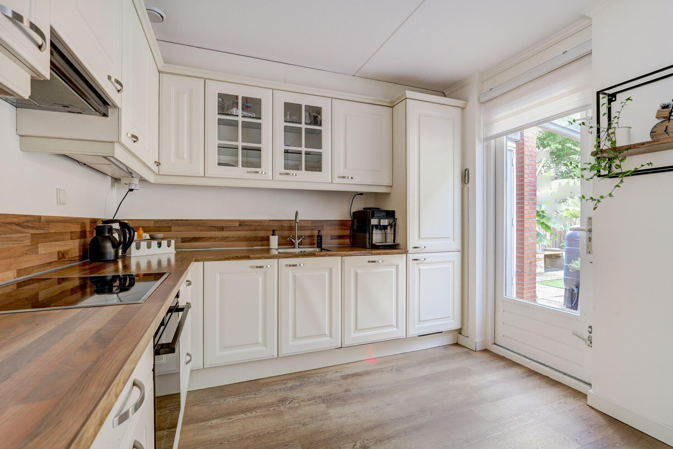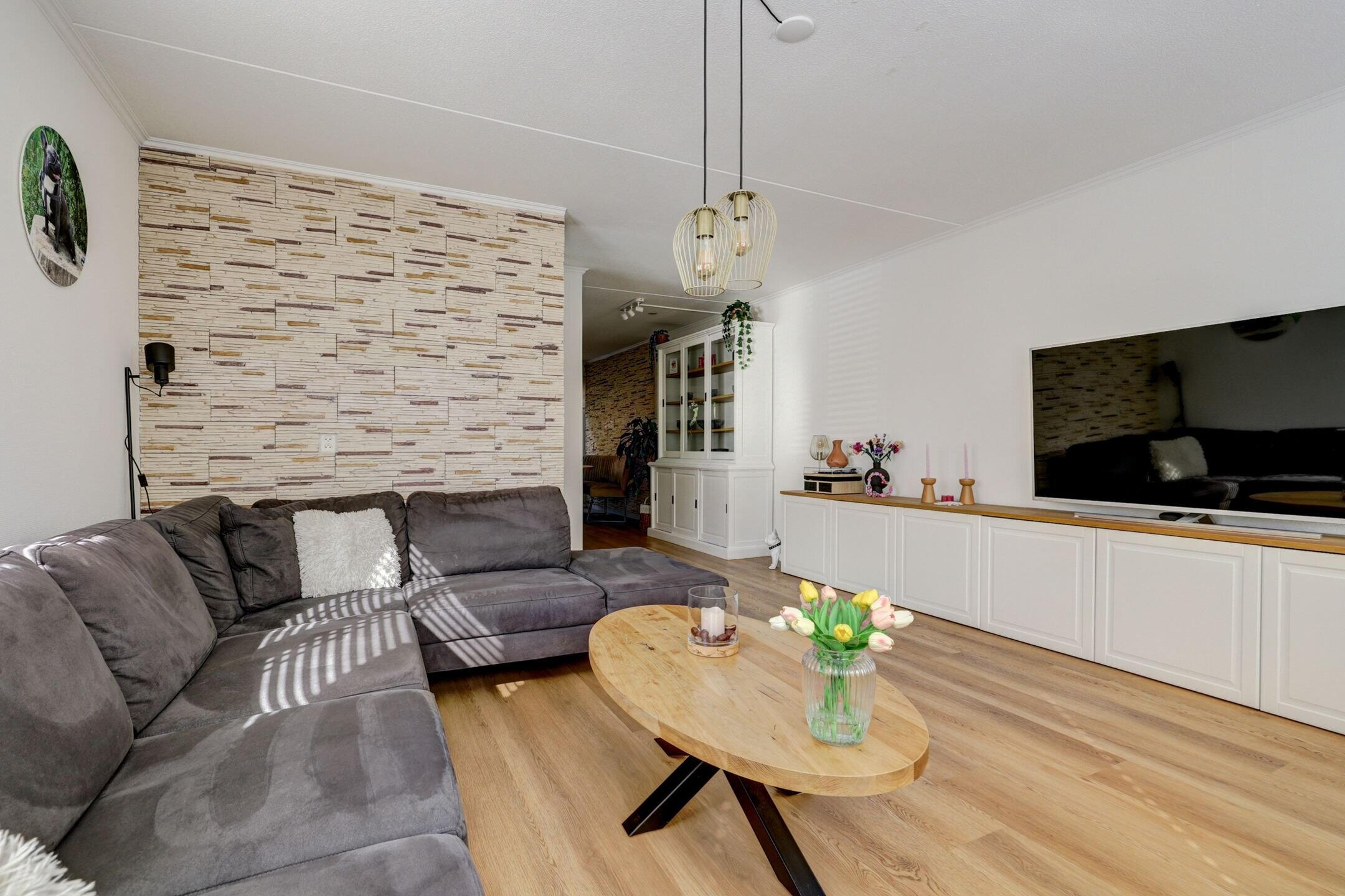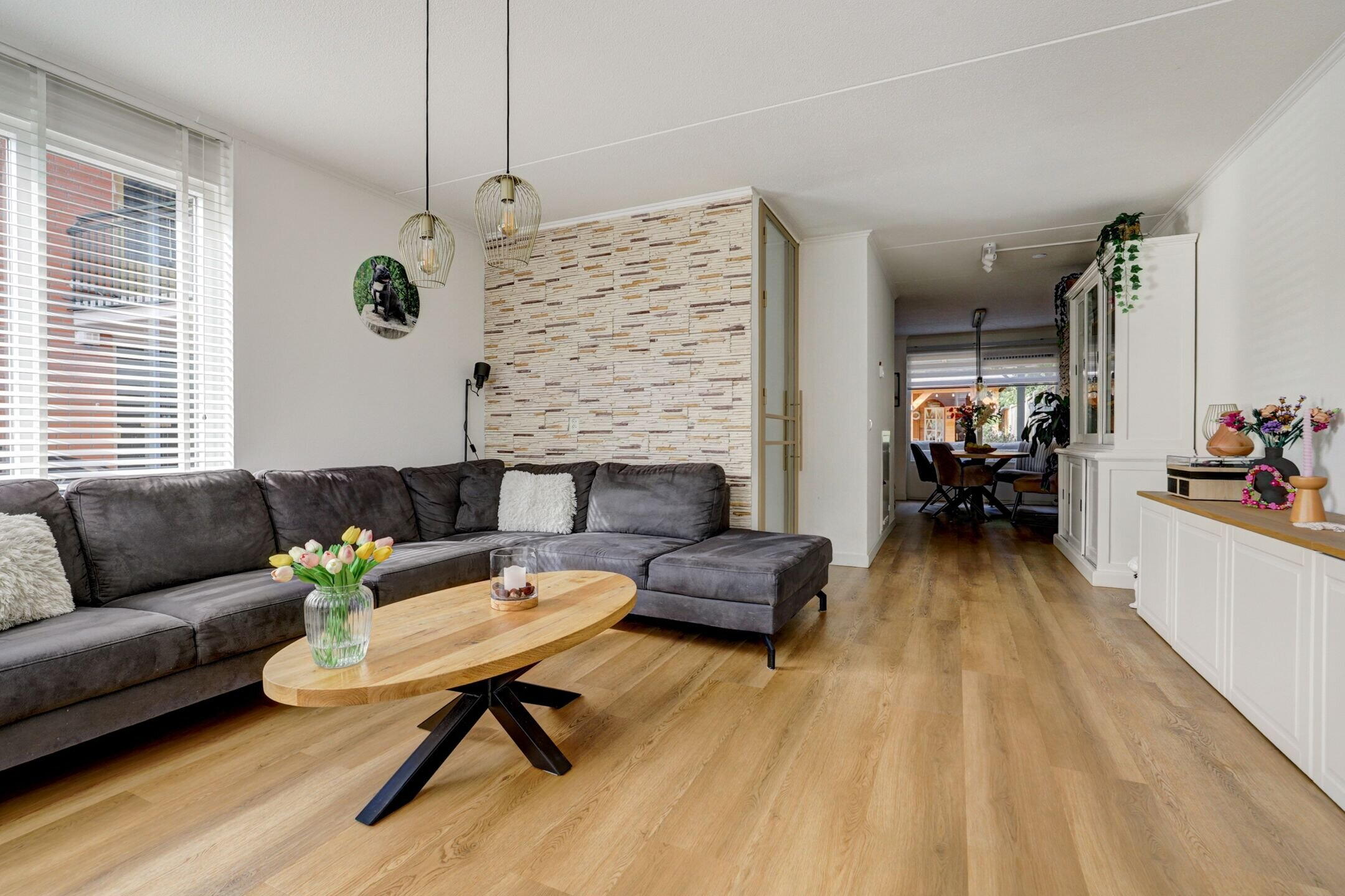The living room is bright and airy, with large windows that let in natural light all day. The sitting area feels warm and welcoming—a wonderful place to unwind. At the rear, you’ll find the Brugman kitchen (2013), equipped with various built-in appliances and plenty of space for a large dining table. Extra storage is available under the stairs. The light PVC flooring with underfloor heating (2024) adds warmth and charm to the entire space.
