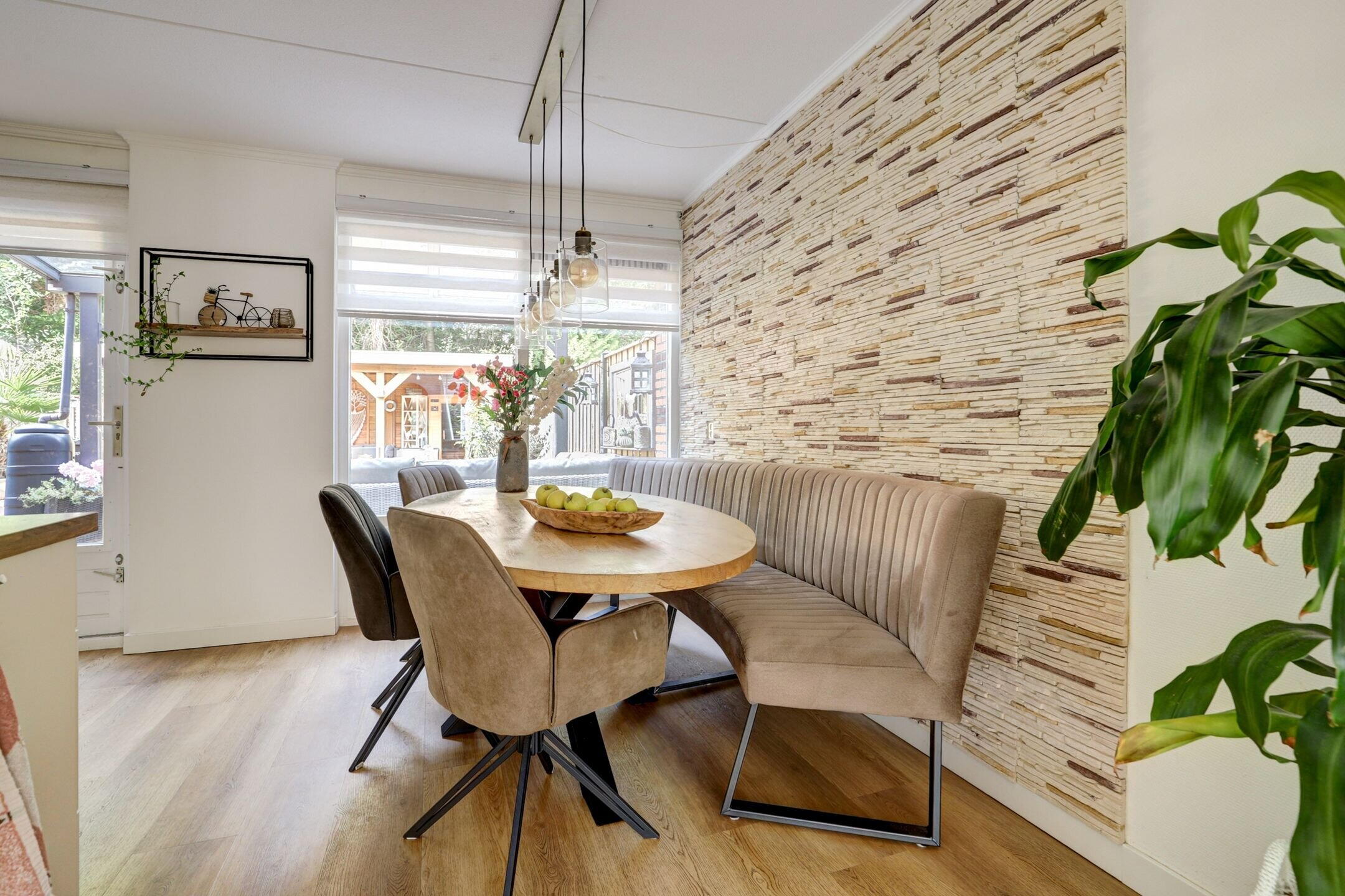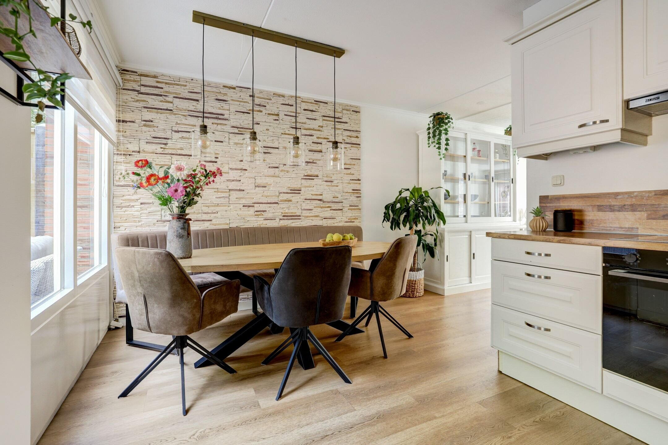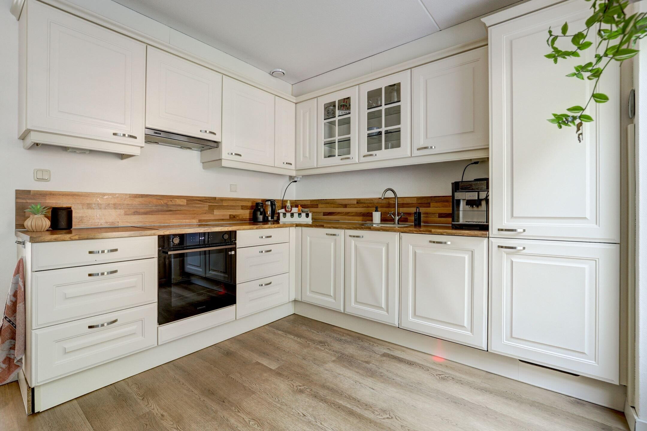 The living room is bright and airy, with large windows that let in natural light all day. The sitting area feels warm and welcoming—a wonderful place to unwind. At the rear, you’ll find the Brugman kitchen (2013), equipped with various built-in appliances and plenty of space for a large dining table. Extra storage is available under the stairs. The light PVC flooring with underfloor heating (2024) adds warmth and charm to the entire space.