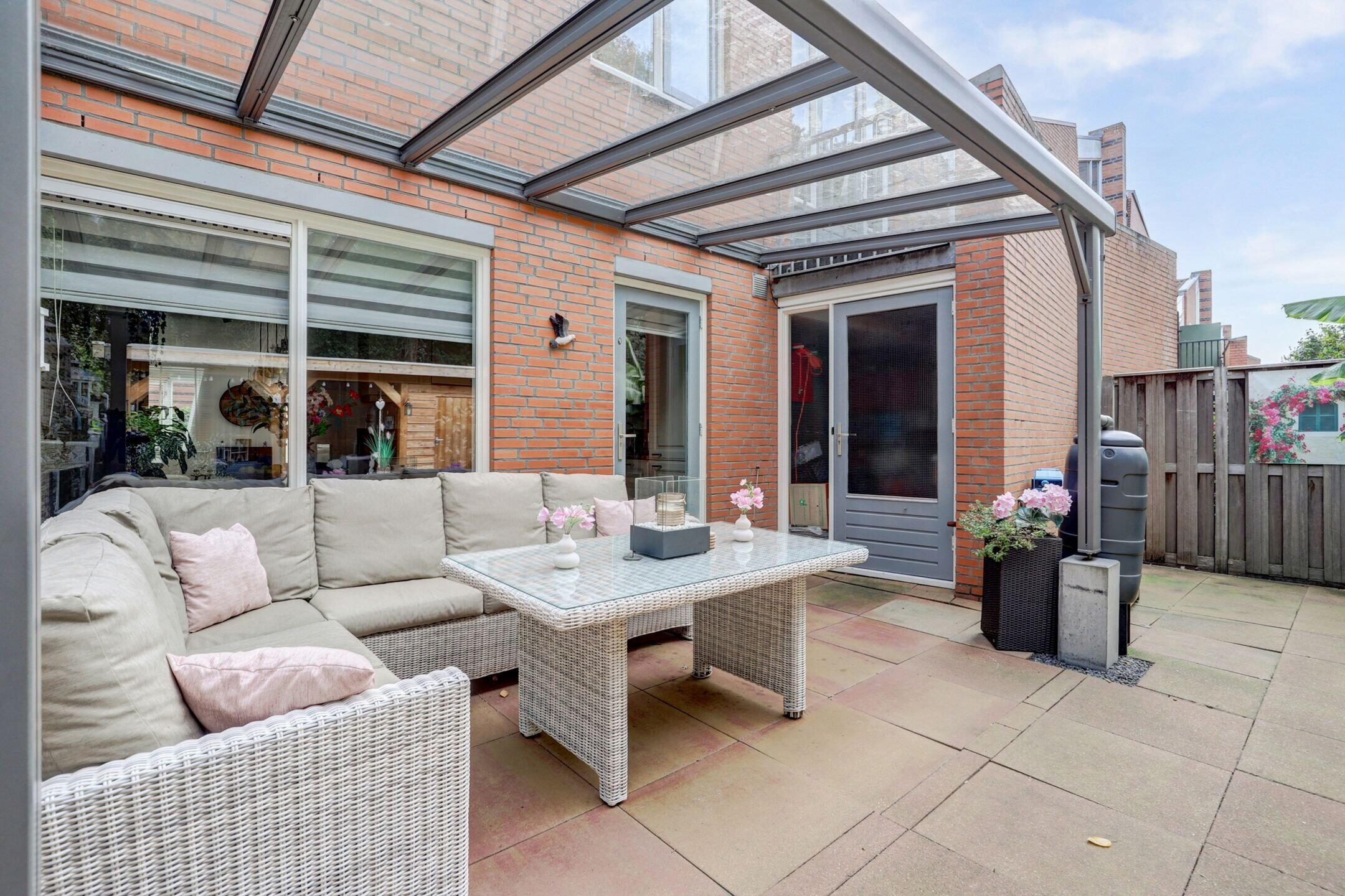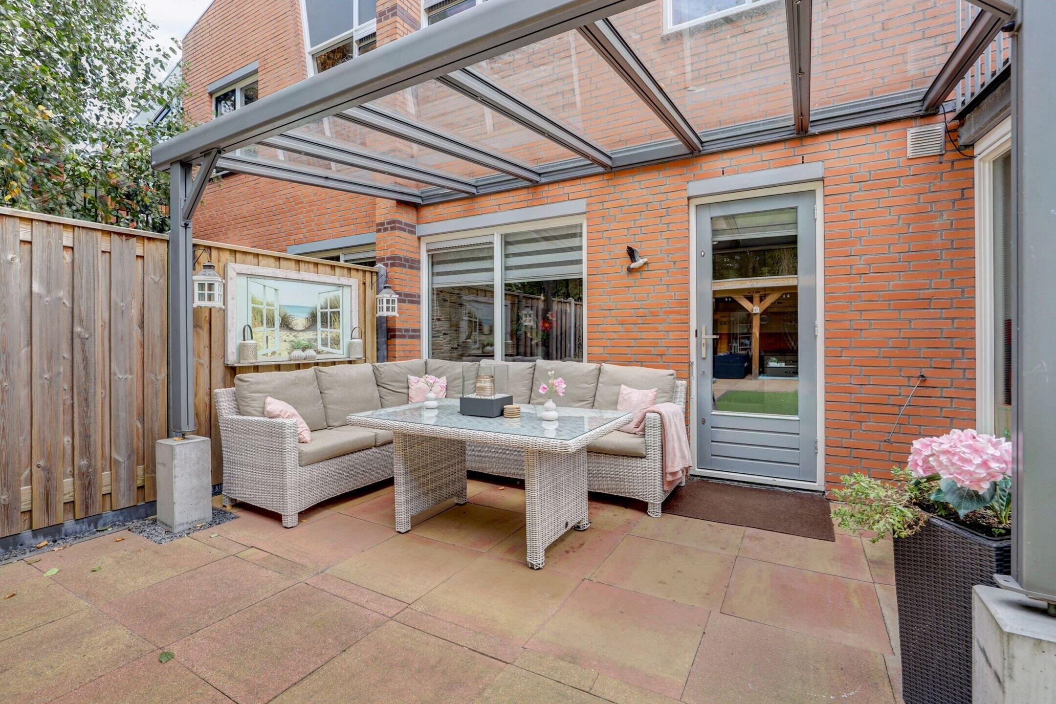 Zodra je de keukendeur uitstapt sta je onder de mooie glazen overkapping, voorzien van sfeerverlichting. Een heerlijke plek om te genieten van de avondzon.